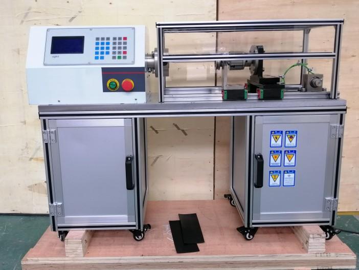 該機型采用高性能交流電機作為動力輸出,配以高精度減速電機,從而使動力能平穩輸出。電機的驅動采用高可靠、高穩定變頻器,提高機器運行的平順性,降低功耗。一側夾頭固定在電機輸出軸,另一側夾頭固定在可移動軸承座。移動座采用直線軸承,摩擦阻力小,保證了軸向移動的平直度。軸向拉緊力采用砝碼施加,通過10:1的L型杠桿,將作用力施加在線材上。