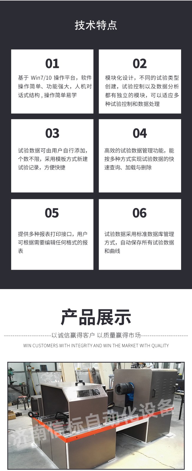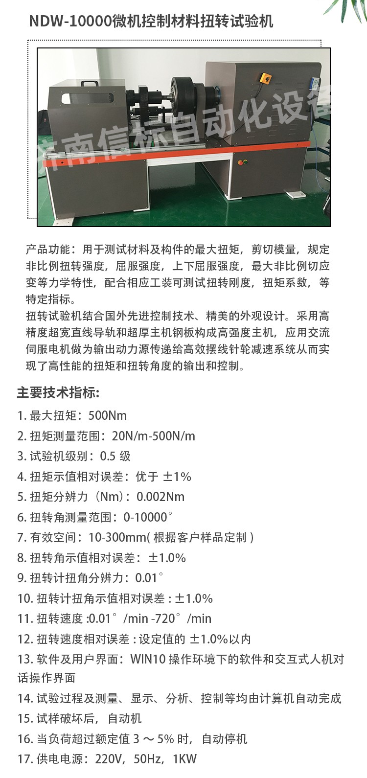 滿足及參考標準: 1. GB/T2611-2007《試驗機通用技術要求》 2. GB/T10128-1998/2007 《金屬室溫扭轉試驗方法》 3. ISO7800-2003金屬材料單軸扭轉試驗方法 4. ASTM A 938-2004金屬線扭轉試驗方法 5. ASTM A938-07 鋼絲扭轉試驗的試驗方法 用于測試材料及構件的最大扭矩,剪切模量,規定非比例扭轉強度,屈服強度,上下屈服強度,最大非比例切應變等力學特性,配合相應工裝可測試扭轉剛度,扭矩系數,等特定指標。 構成高強度主機,應用交流伺服電機做為輸出動力源傳遞給高效擺線針輪減速系統從而實現了高性能的扭矩和扭轉角度的輸出和控制。 控制系統采用世界流行的高速PCIE標準并行總線設計,采用美國BB公司放大器,AD公司的高速模數轉換器及CPLD構成數據采集系統及高精度扭矩傳感器構成測量控制系統??刂破骺蓴U展支持,LAN USB CAN等通訊方式。 試驗機專業軟件可實現自動求取最大扭矩、抗扭強度、上下屈服扭矩、規定非比例扭矩、切變模量等數據和指標,計算機控制系統對試驗過程的控制和數據處理符合相應國際標準的要求,多種數據輸出方式,標準報表,Excel,word,開放式數據庫MDB及原始數據源txt形式本機無污染、噪音低,效率高,具有較寬的調速范圍。本機適用于各種金屬、非金屬及復合材料的力學性能指標的測試,完全符合國家相關標準的要求。 結構組成 加載單元:采用行星減速機作為減速單元配置伺服電機加載,減速機定制采用零背隙結構,此結構可保證在扭轉過程中,無系統間隙,除滿足常規靜態測試外還可進行低周疲勞,過零時(扭矩從正向最大減小到零在反向加載到最大的中間過程為過零,)可保證曲線的完整性和數據的準確。